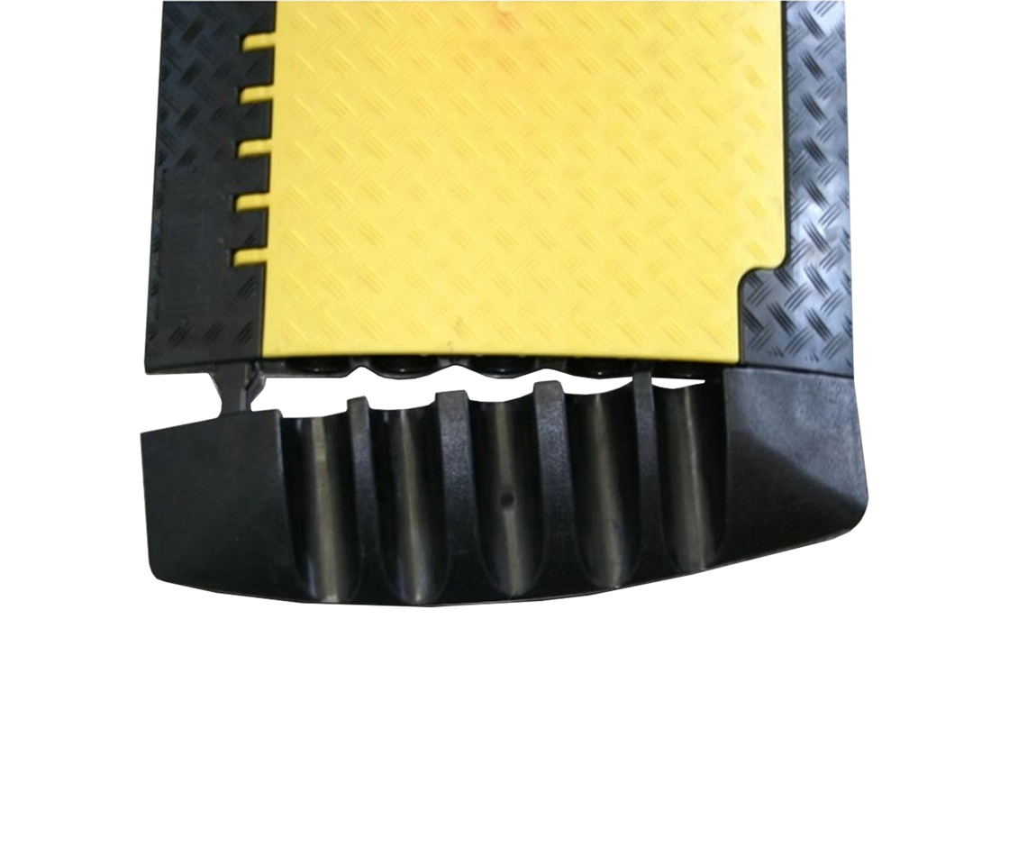 In collaborazione con l'industria e aziende di noleggio rinomate è stato sviluppato il nostro nuovo fiore all'occhiello. Passacavo per carichi pesanti in poliuretano nero riciclabile con maniglie integrate per applicazioni impegnative. Coperchio in poliuretano giallo antiscivolo con alta visibilità e bloccaggio sicuro. Cerniera autopulente brevettata. 5 canali: 1 canale 60 x 63 mm, 2 canali da 61 x 59 mm e 62 x 65 mm. Tre canali adatti per raccordi tipo C. Portata circa 5 t / 20 x 20 cm. Classe di reazione al fuoco B2 (DIN 4102), certificato DEKRA (DIN 31000, EN 61537). Resistente a olio, acidi, benzina e contatto temporaneo con solventi. Protezione affidabile di cavi, tubi e persone per uso interno ed esterno. Terminali per ingresso/uscita sicura di cavi e tubi disponibili come accessori. Dimensioni 70 x 69,6 x 8,7 cm; peso 21,4 kg.